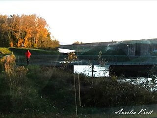 日没時に自然の中でアナルプラグを使って歩く